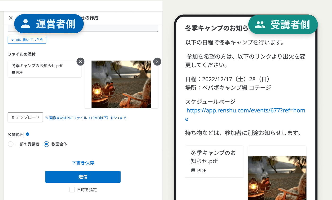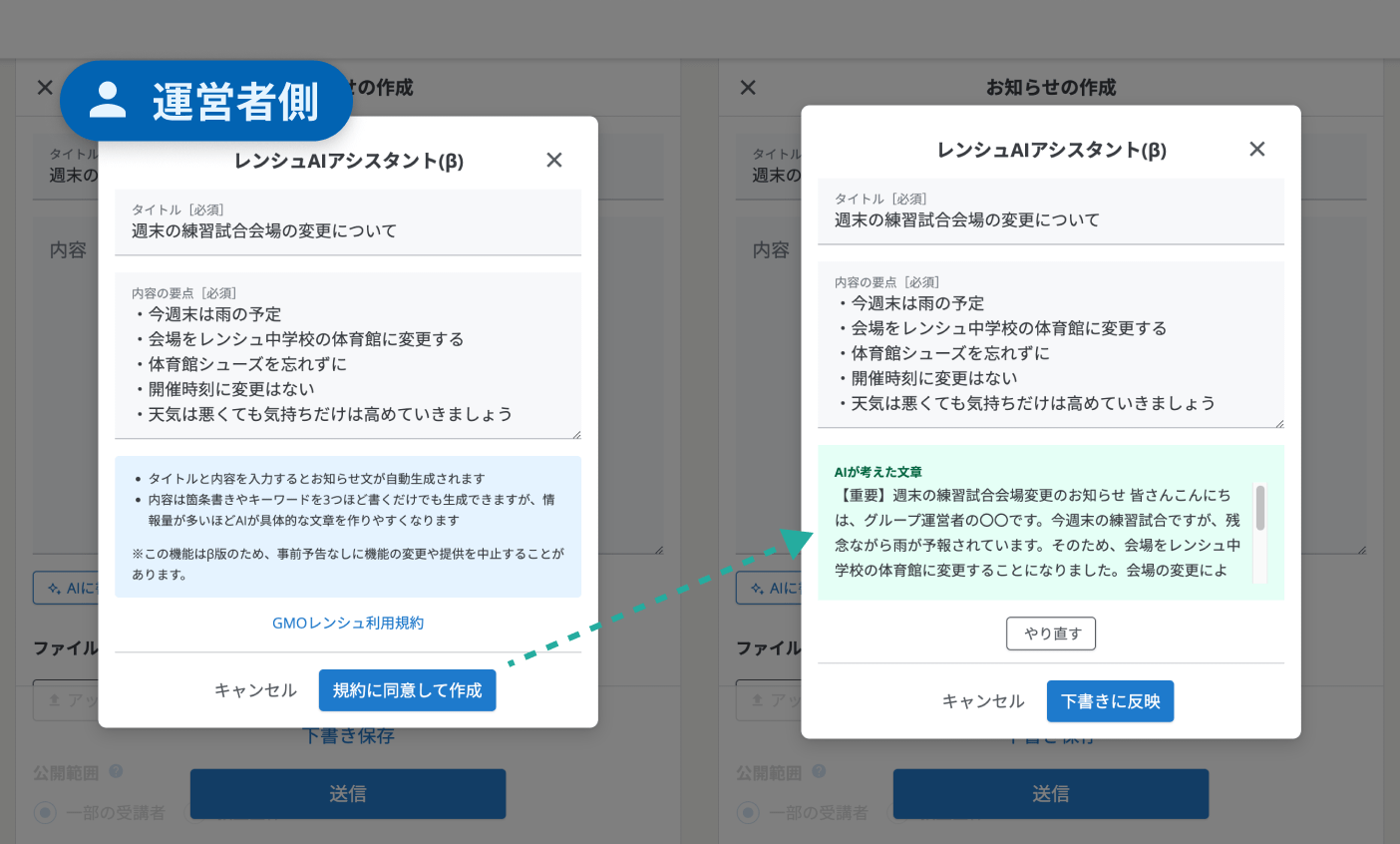 レンシュAIアシスタント(β版)が、箇条書きなど簡単な入力内容をもとに、お知らせの文章を自動で生成します。