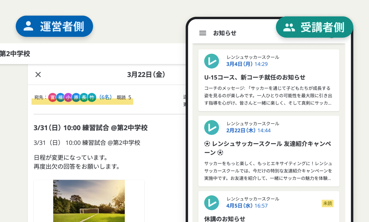 送信したお知らせの宛先受講者ごとに、「既読・未読」を確認できます。また、受講者側のアカウントでも、未読のお知らせを表示させることで、見落としを防ぎます。