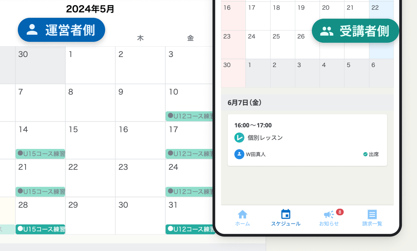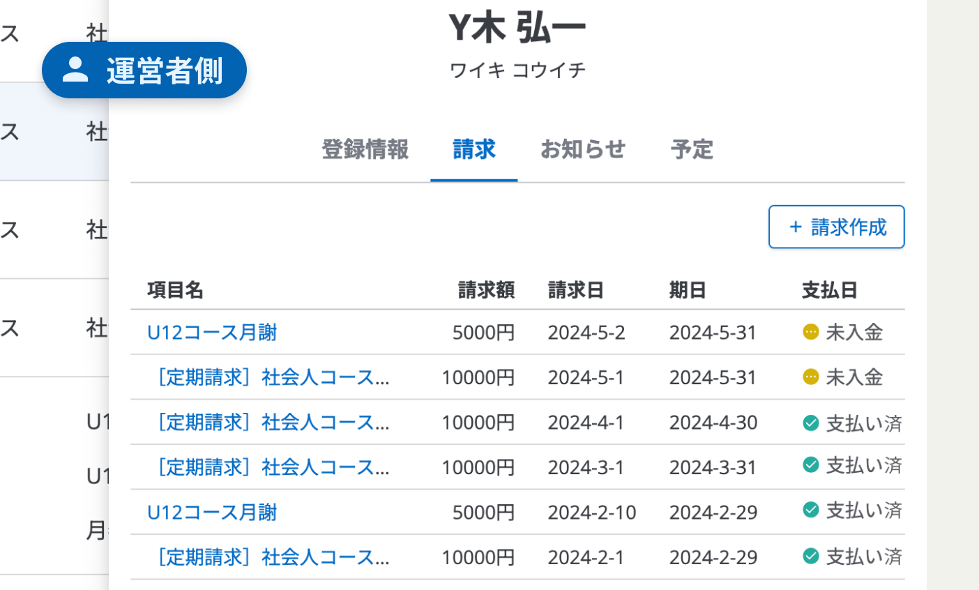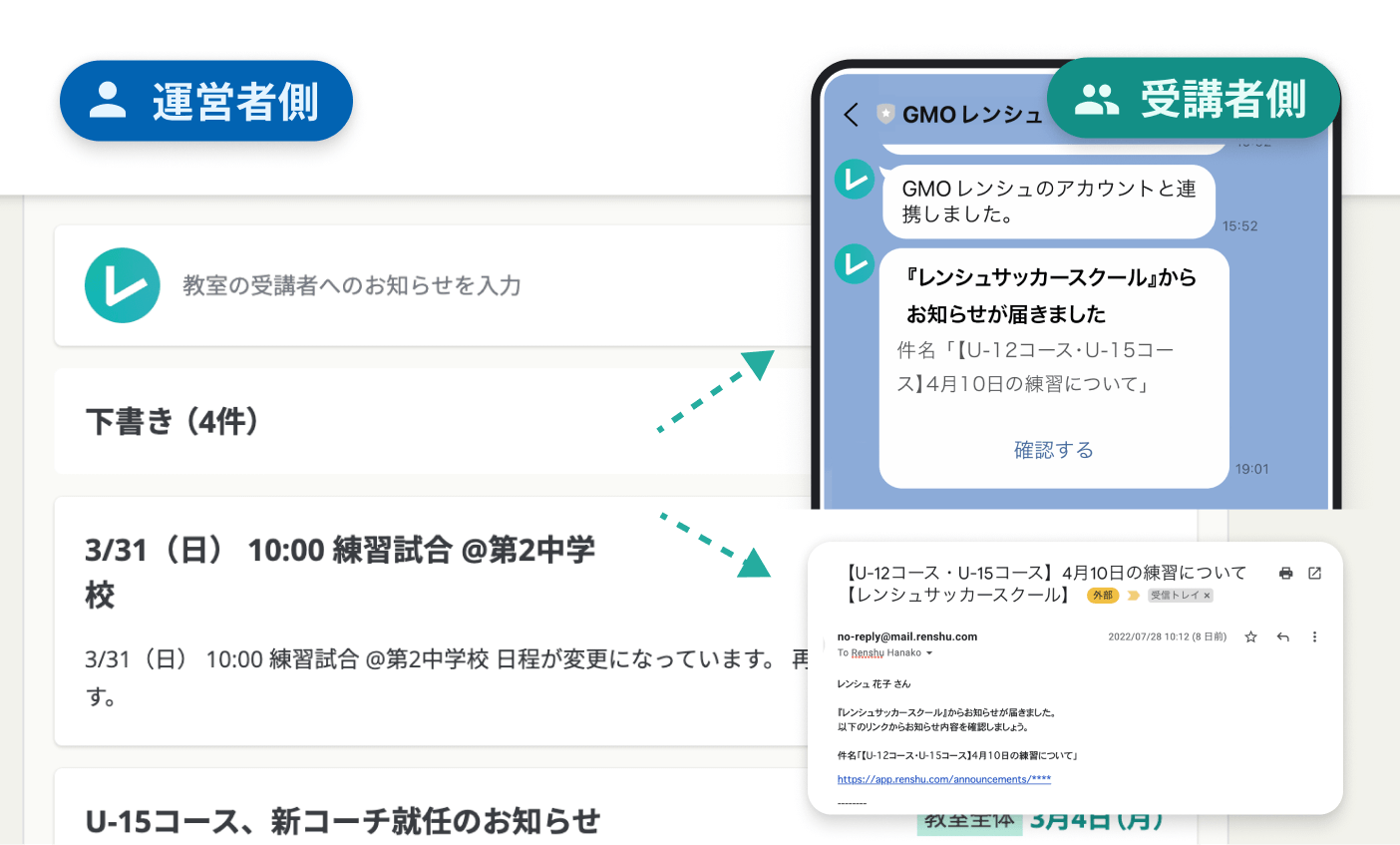 新しいお知らせの公開や請求の作成タイミングで受講者に通知がされます。また、受講者が教室に入会や出欠の変更が発生した場合に運営者にも通知がされます。